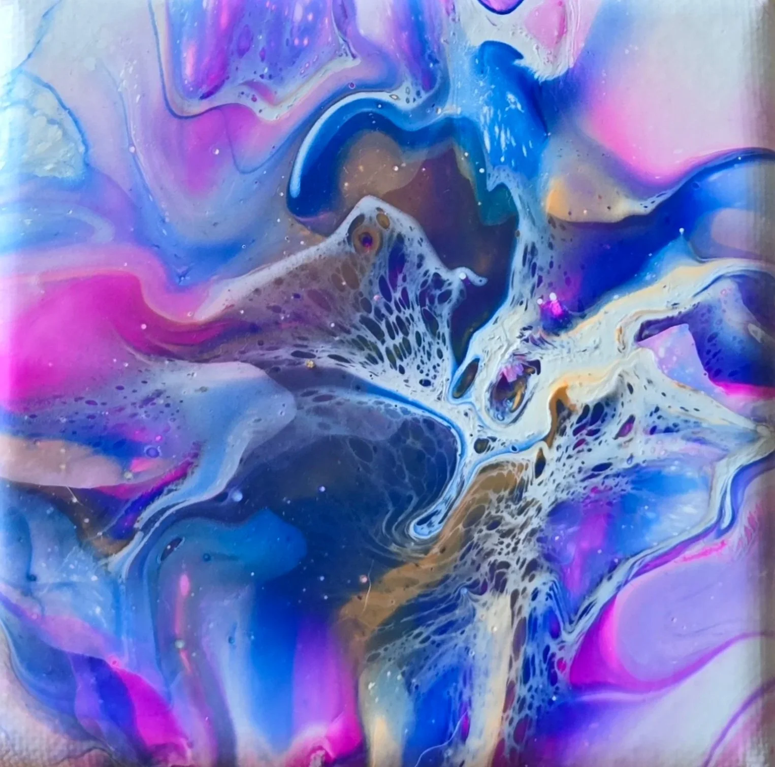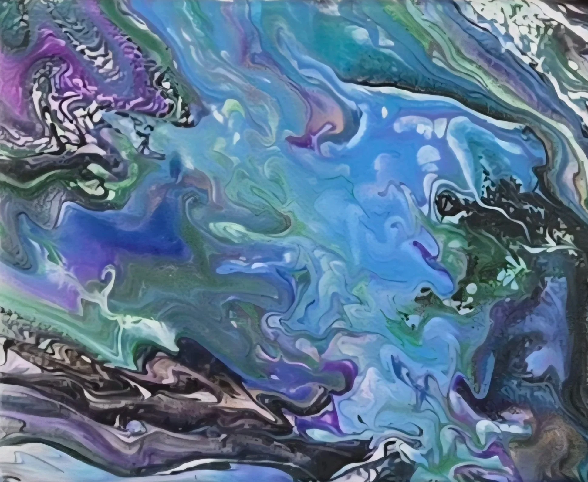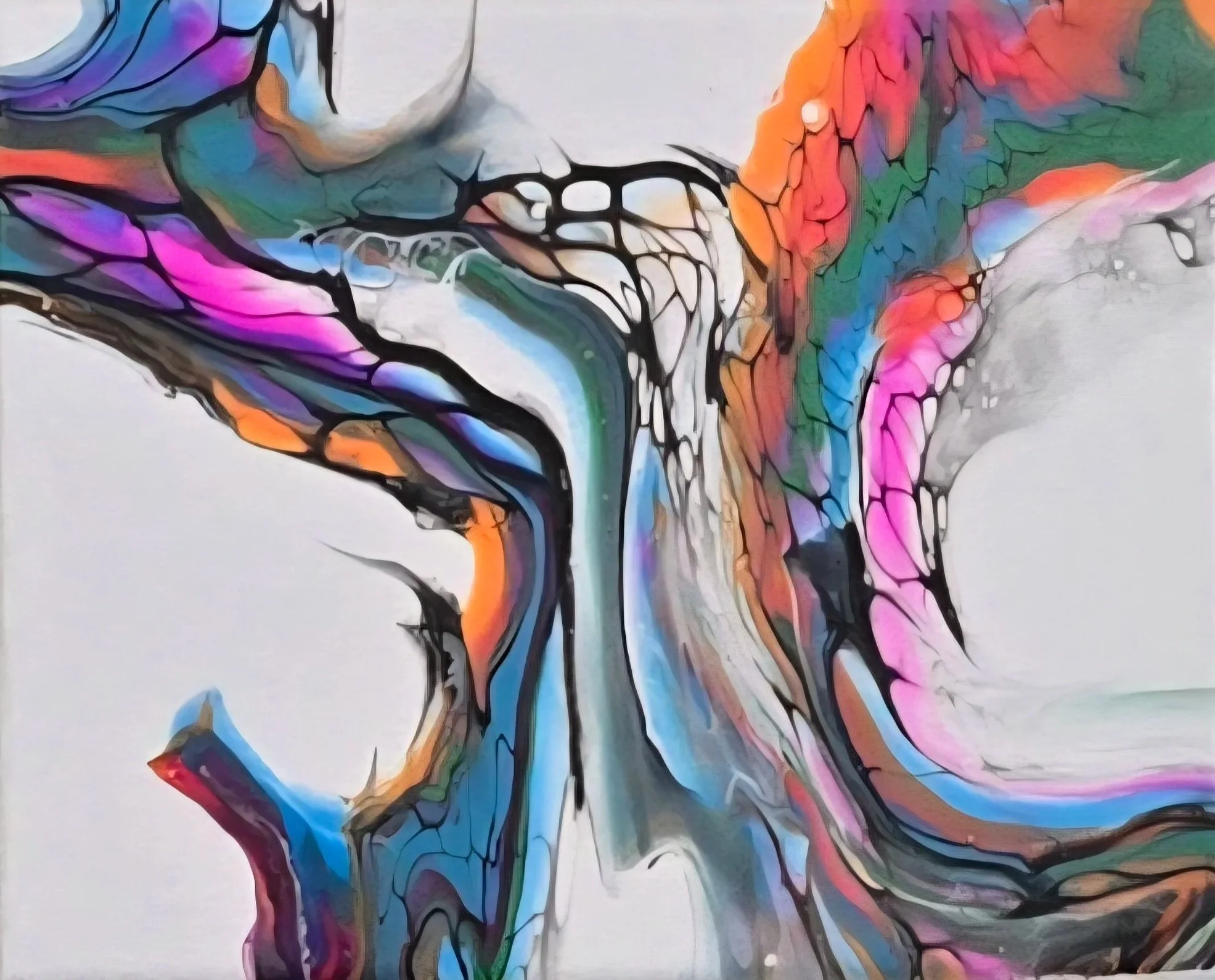 “Flow-motion is my exploration of movement — and my ongoing debate with gravity. My process is a mix of precision and surrender: I pour, tilt, and guide the paint until it decides where to land. Every piece begins as an act of control and ends as an act of trust.